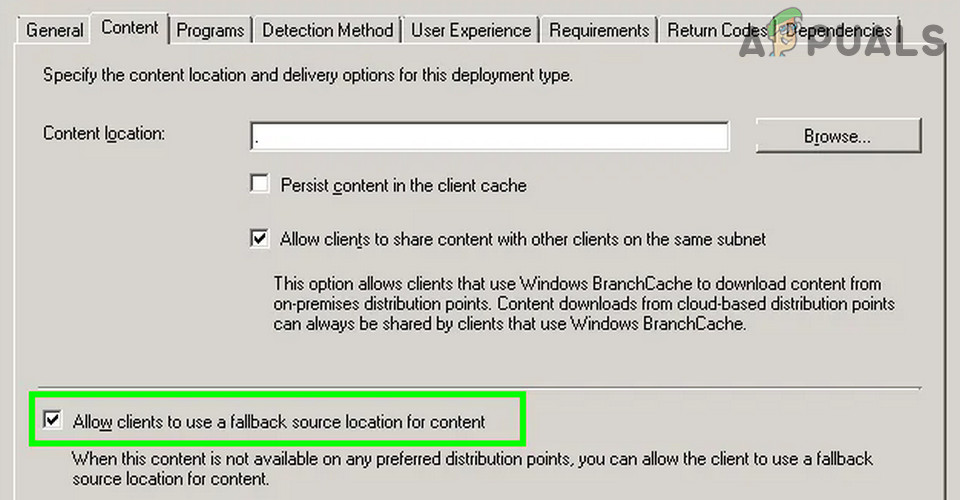 - Now, checkmark the option of Allow Clients to Use a Fallback Source Location for Content and make sure the Deployment Options dropdown is set to Download Content from the Distribution Point and Run Locally.