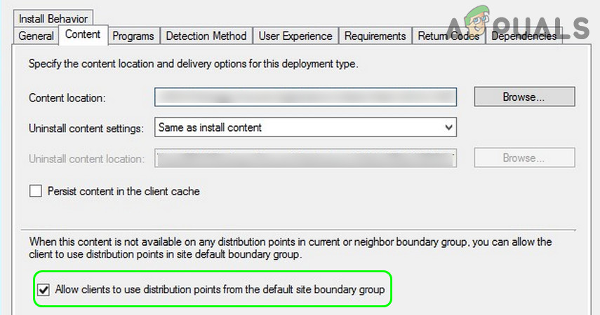 - Now head to the Content tab and checkmark the option of Allow Clients to Use Distribution Points from the Default Site Boundary Group.