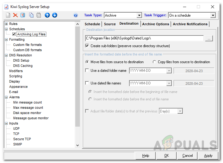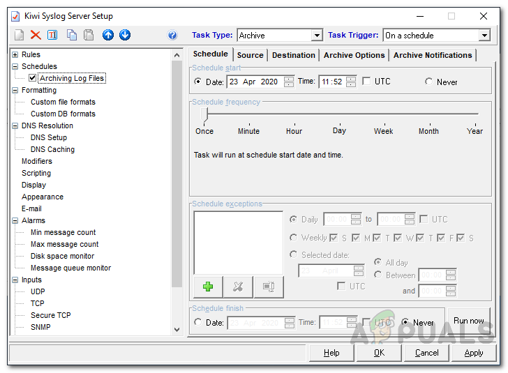 As mentioned above, you can automate certain tasks with the help of Kiwi Syslog server. These tasks include running a script, executing a program, archiving log files as well as cleaning up tasks. Kiwi Syslog allows you to create upto 100 scheduled tasks that are triggered to initiate when the Kiwi Syslog Server application either starts or stops as well as on a schedule. So, without further ado, let’s get into it.