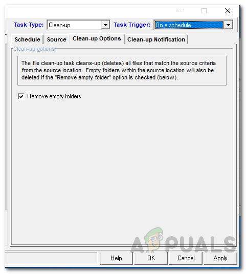 - For the Task Type, choose Clean-up from the drop-down menu provided and then choose a Task Trigger per your need.