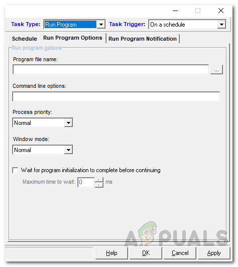 - After that, on the Program Options tab, specify the location of the program that you wish to execute and follow it up with any command line parameters that you wish to be passed to the program.