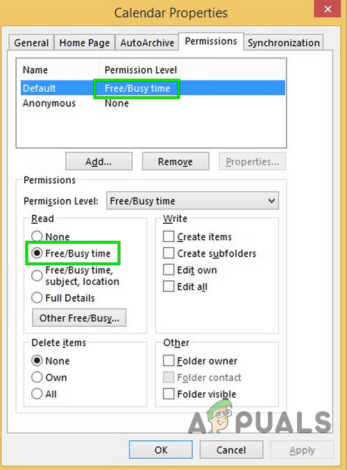 Set Free/Busy Permissions - Click Add and assign the scheduler “reviewer” permission.