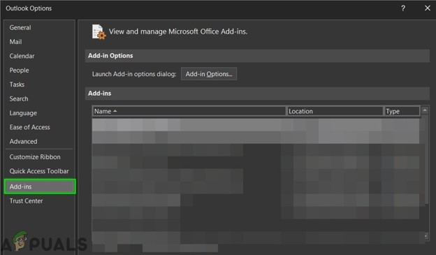 Open Add-ins - Find the “Manage” dropdown at the window’s bottom, choose the add-ins type (e.g., COM Add-ins), and click “Go”.