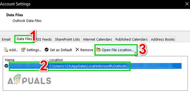 Access Account Settings - Go to Data Files, select the user file, and click “Open File Location”.