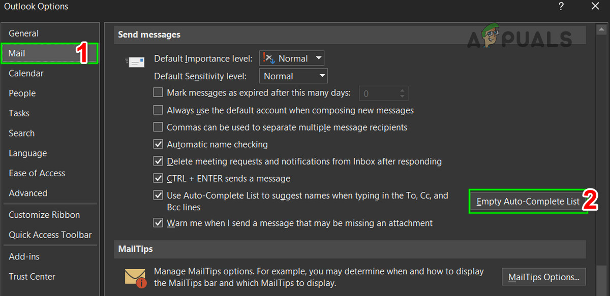 Open Outlook Options - Click on Mail in the left pane of the Options window.