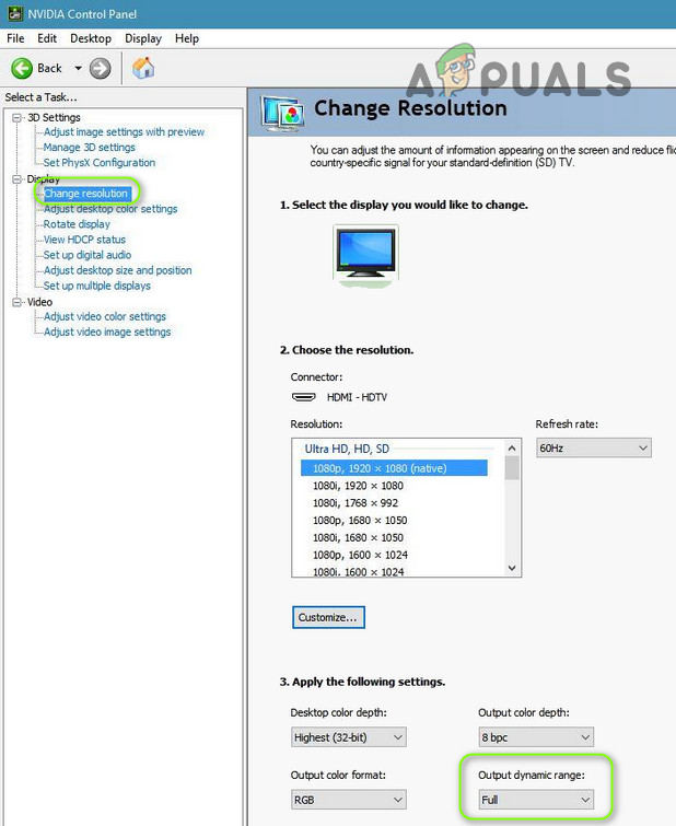 - Now, in the right tab, make sure the required display is selected and in the Apply Following Settings, set the Output Dynamic Range to Full.