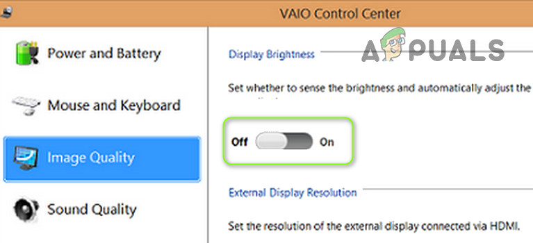 Disable Display Brightness in Vaio Control Center - Upon reboot, check if the full-screen dimming issue is resolved.