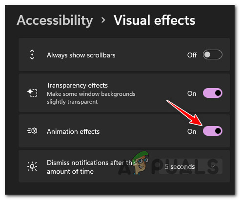 - Buggy animation effects – Early Windows 11 builds are plagued by several bugs in regards to the animations that you can toggle on or off from the Accessibility tab. If you have any custom animations enabled, you might be able to resolve your screen flickering issues by disabling them from the Accessibility tab.