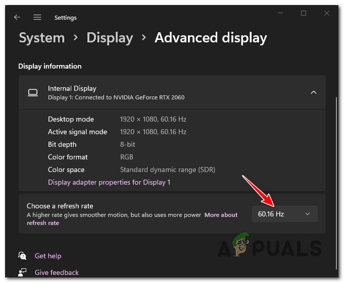 Open up the Advanced Display menu - Once you’re inside the Advanced display menu, scroll down under Display information and modify the drop-down menu associated with Choose a refresh rate to a lower value.