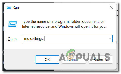 - Press Windows key + R to open up a Run dialog box. Next, type ‘ms-settings’ inside the text box, then press Enter to open up the Settings menu.