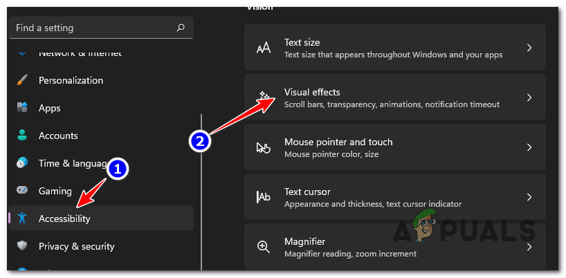Accessing the Visual Effects tab - Next, go over to the right-hand section under Visual effects, then toggle the toggle associated with Animation effects to Off.