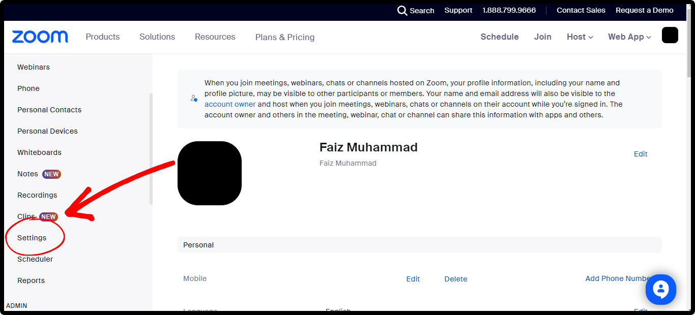 - In your browser, open the Zoom Web Portal and scroll down in the left vertical menu to locate Settings. Click on it.