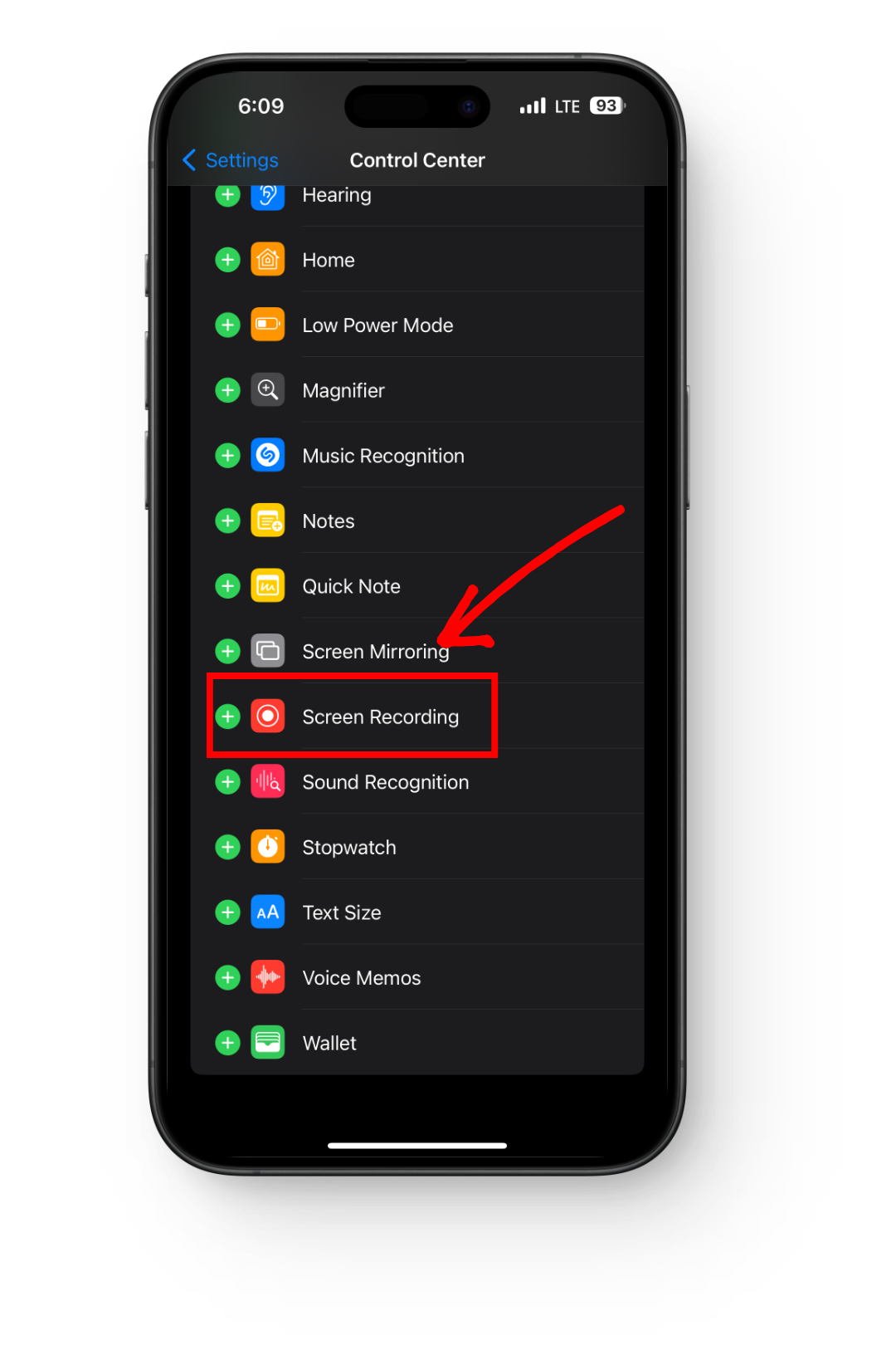 Open Settings and go to Control Center - Scroll to locate Screen Recording and tap on the green plus sign.