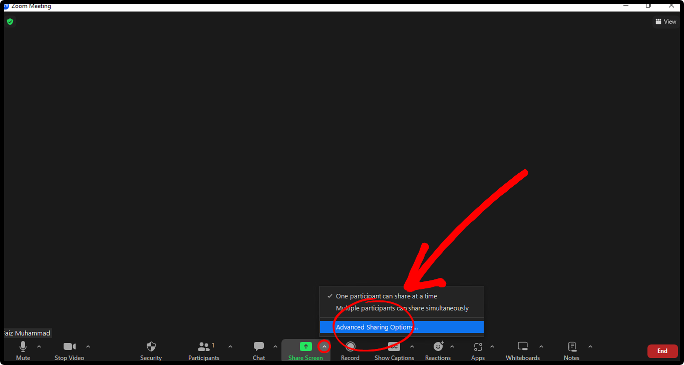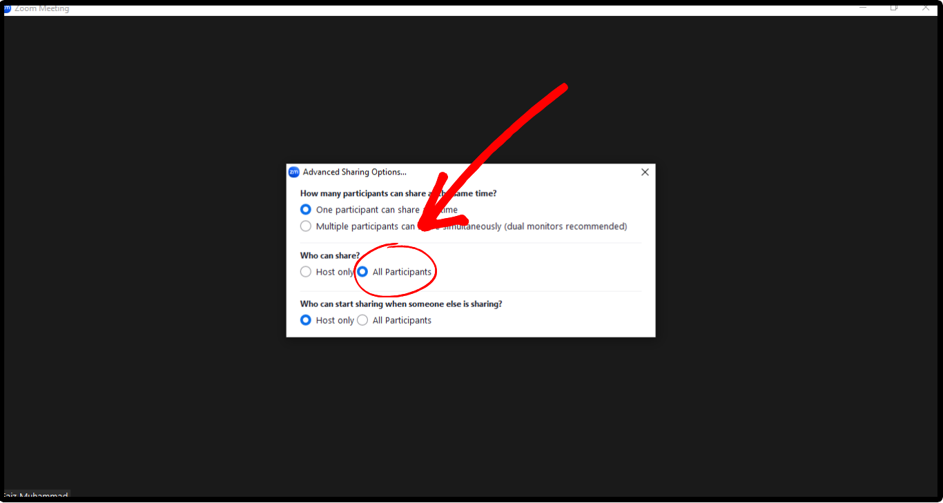 Open Advanced Sharing Options - Under “Who can share?”, click on All Participants.
