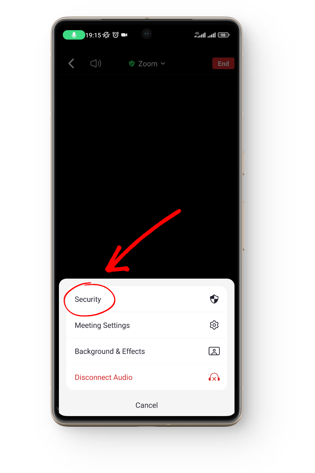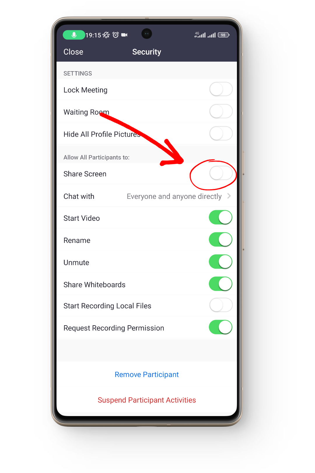 Open Security Settings - Under “Allow all participants to”, you will see a toggle for Share Screen. Tap on it to turn it on.