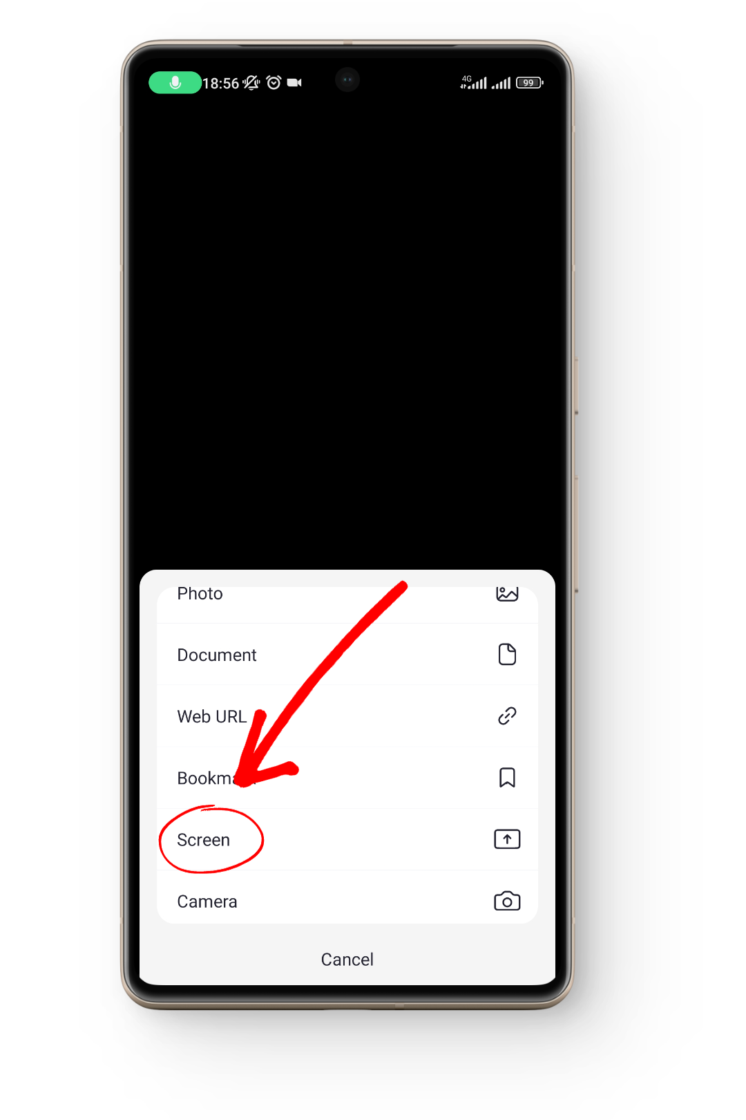 Choose Screen from the options that appear - A confirmatory message will appear. Tap on Start Broadcast to begin sharing your screen.