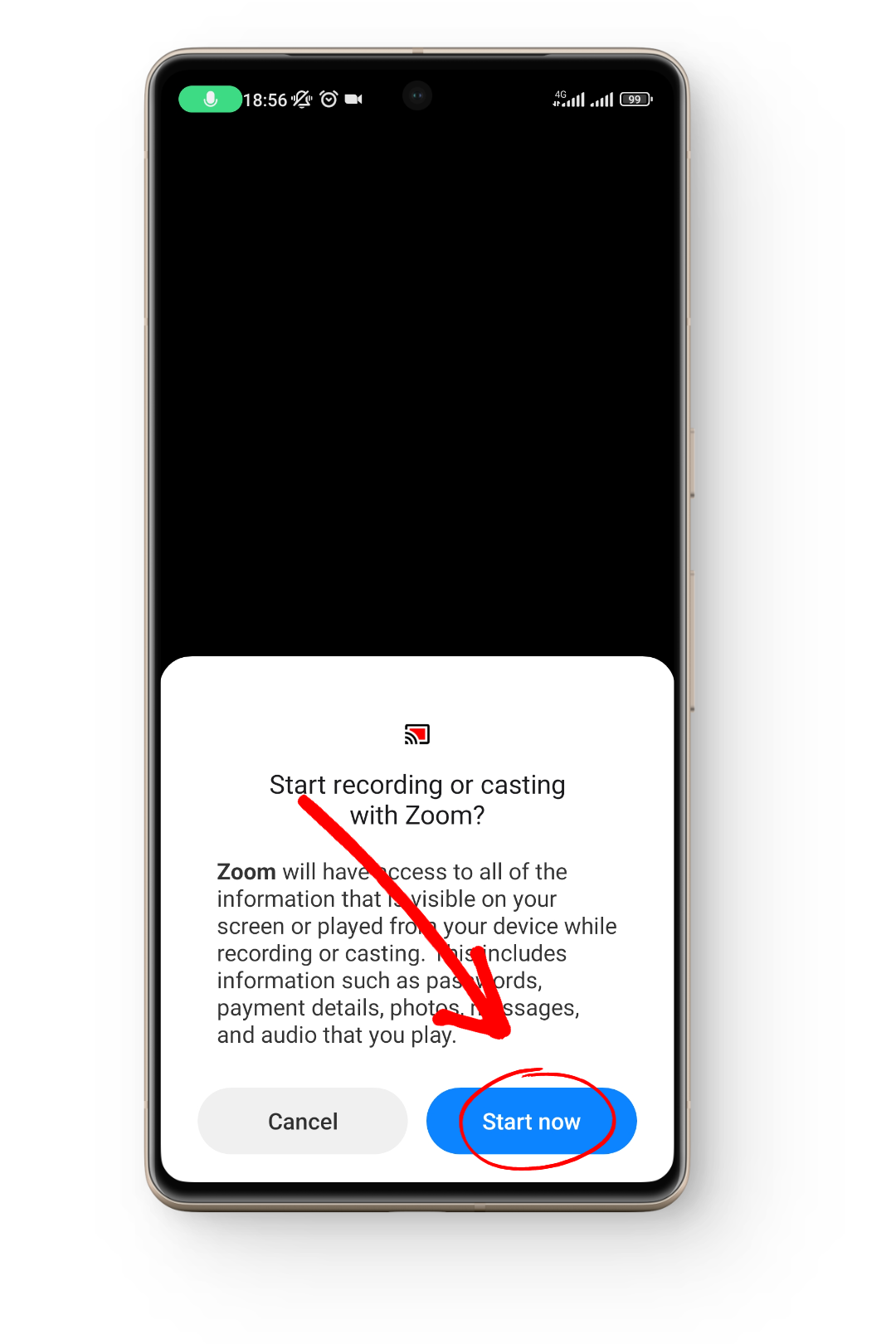Tap on Start Now - If it’s the first time you are sharing your screen, you’ll have to give the Zoom app permission to Display over other apps. Tap on the toggle to turn it on.