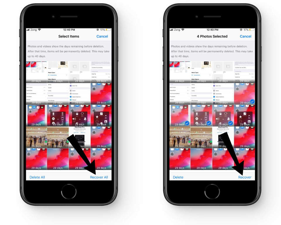 Tap on the Select button - You can either restore all, or select only the photos you want and tap Recover.