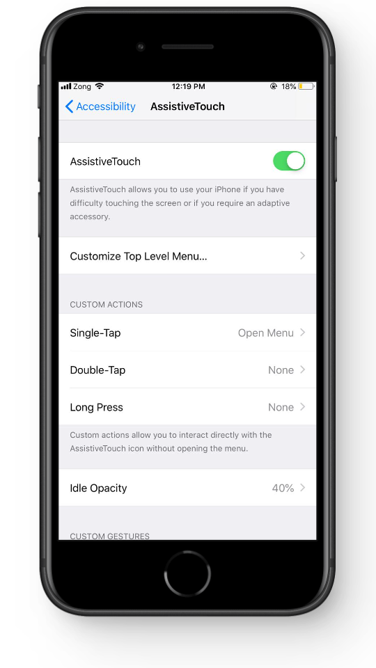 Select AssistiveTouch - Toggle AssistiveTouch on. You can also customize what this menu does based on your preferences.