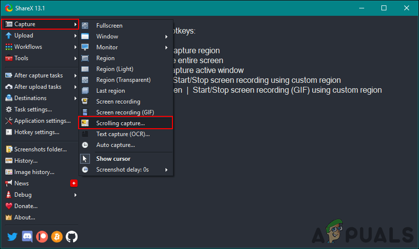 Downloading the ShareX application - Open the application, click on the Capture option, and choose the Scrolling capture option from the list.