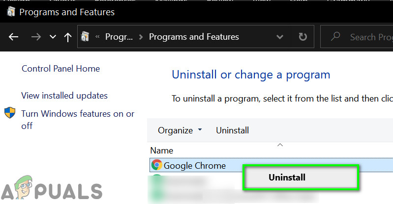 Uninstall a Program - Then in the list of installed programs, right-click on Google Chrome and then click on the Uninstall button and if asked, choose to remove the user data.