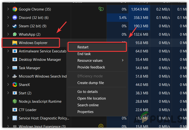 - Once opened, right-click Windows Explorer and select Restart.