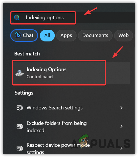 - Click the Start Menu and search for Indexing Options.