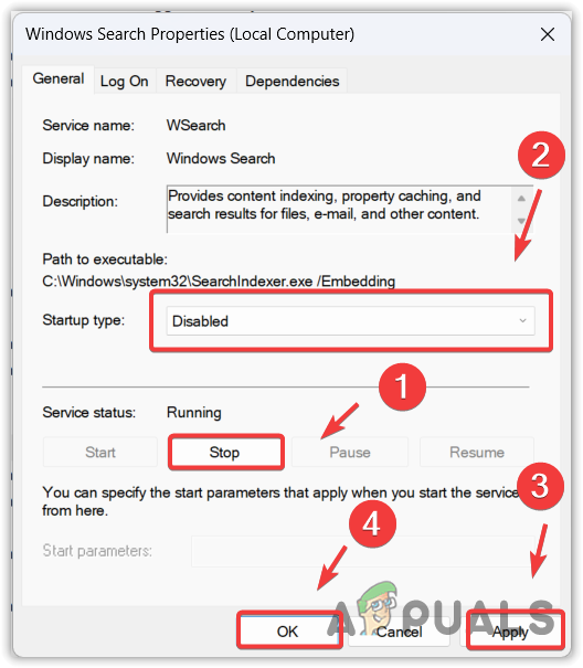 - Stop the service, change the startup type to Disabled, click Apply, and click OK.