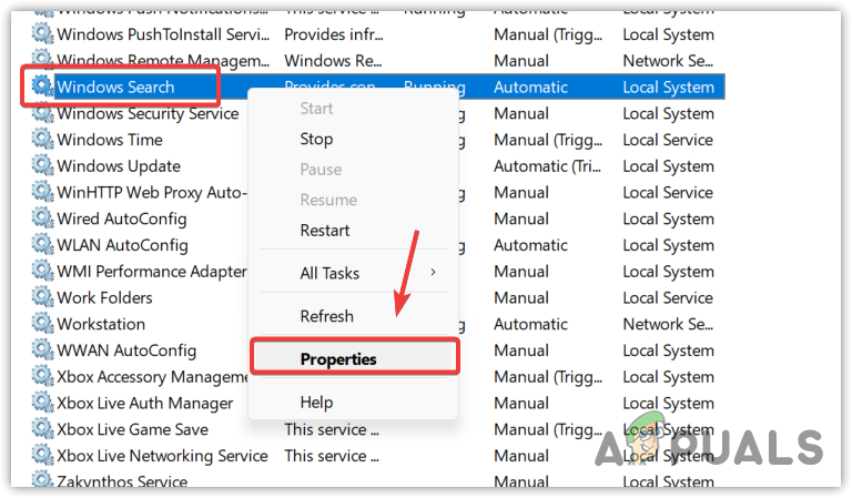 - Find the Windows Search service and right-click on it to select Properties.