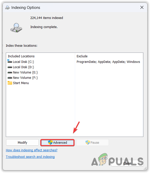 - Open the Indexing Options and click on Advanced.