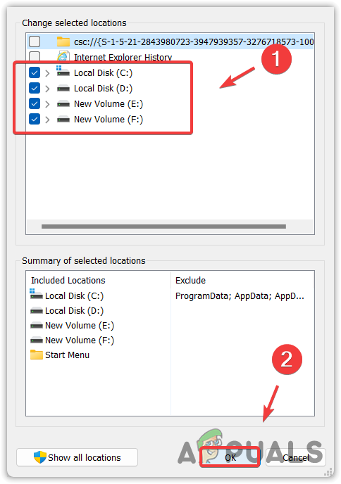 You may have incorrect indexing option settings, which prevent the Windows search indexer from working correctly and cause high CPU or disk usage. Therefore, try configuring the indexing options correctly by following the steps.