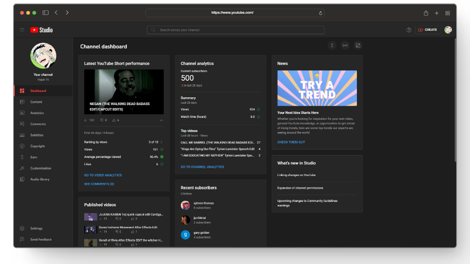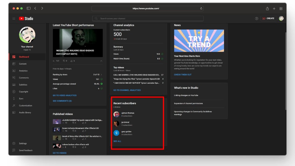 On your dashboard, you’ll also have a Recent Subscribers card where you’ll be able to check who recently subscribed to your channel with their usernames, profiles, and the number of subscribers they have.