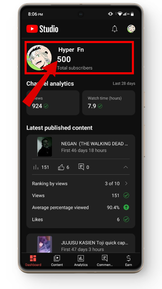 YouTube Studio mobile channel dashboard - Here, under your channel name your subscribers should show up.