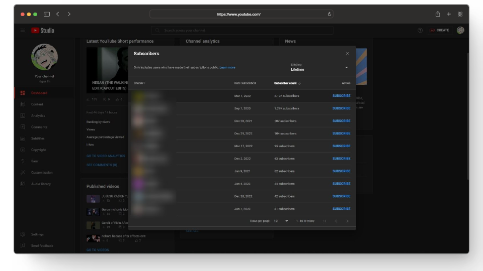 Additionally, if you want a more detailed overview of your recent subscribers you can click on the “See all” option which will open up a window displaying your 100 most recent subscribers to your channel.