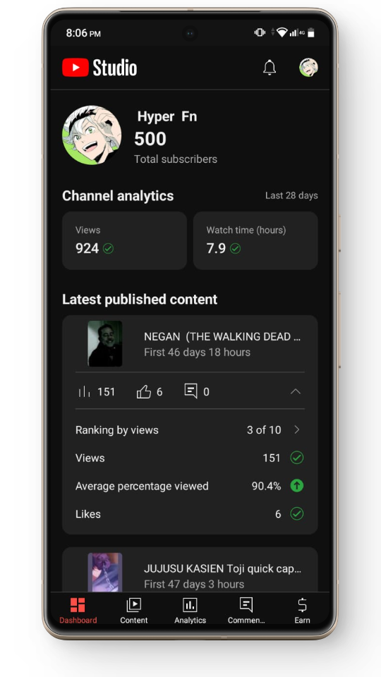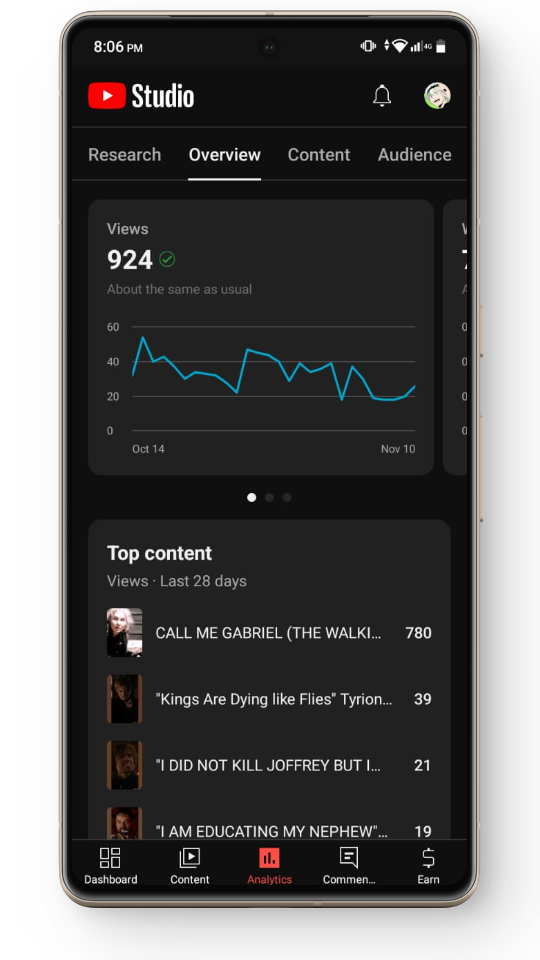 In addition to this, you can also check other metrics (Views, Live subscriber count, Audience reach, etc.) from the YouTube Studio like you would on a desktop. The steps are pretty much the same for both and we suggest exploring the interface on your own a bit to learn more about your channel.
