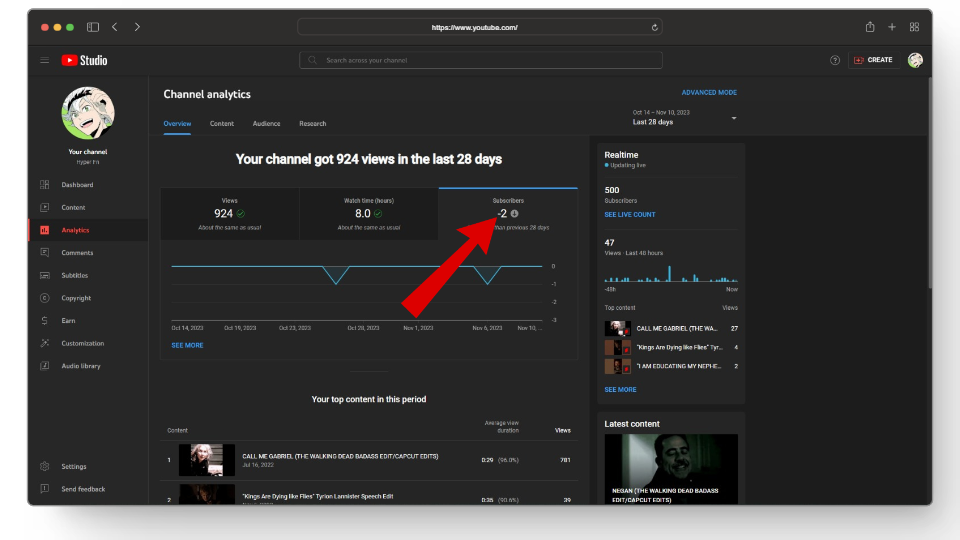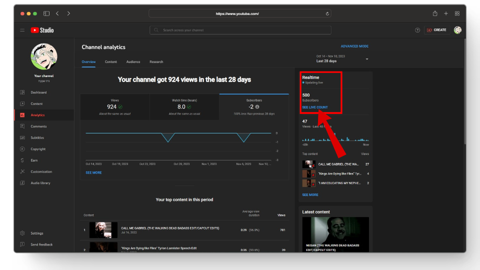 YouTube Studio also allows you to view your live subscriber count to help you get a good idea of how quickly your channel is growing. Here’s how to check your live count: