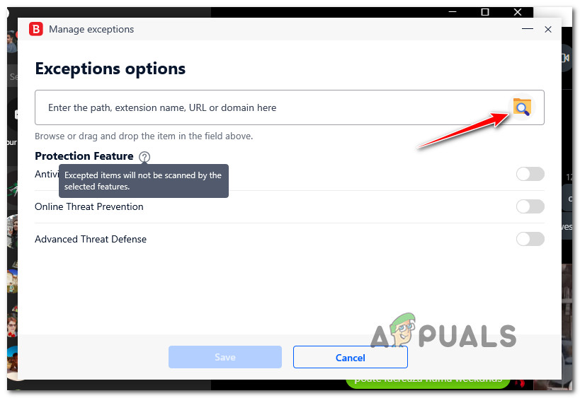 Accessing the Exceptions tab - Now inside the menu Manage Exceptions, make sure to select the Antivirus as the main directory, and after that click on the Add an Exception option.