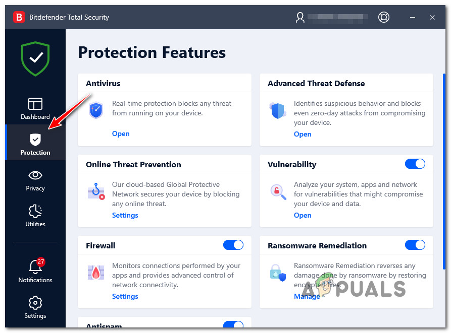 Accessing the Protection tab - Then from the protection menu go to the Open hyperlink option and click on it under the Antivirus