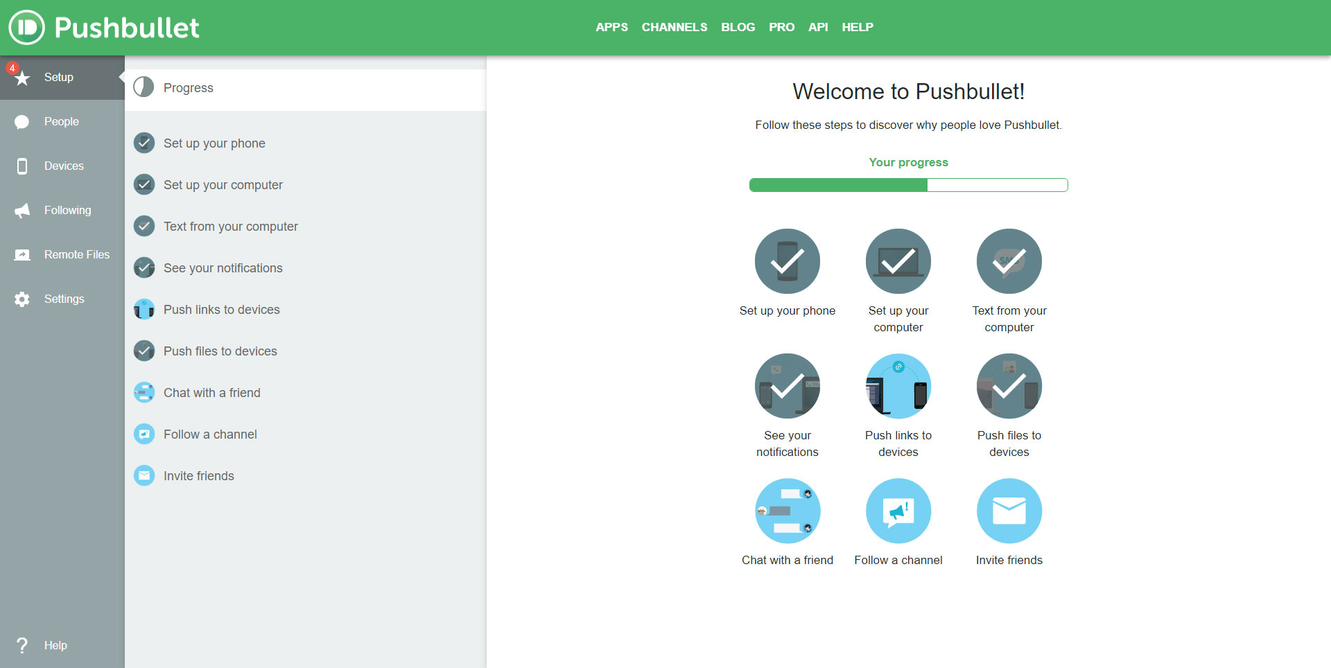In the Pushbullet website, you will find the Pushbullet dashboard. Here you will see which of the services you have activated. You can click on each of them and turn them on if you like.
