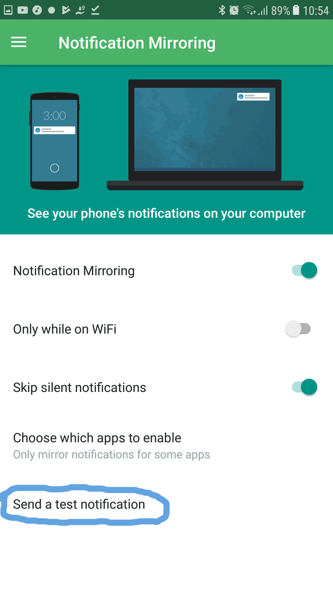 Once you’re all set up with Puchbullet for Android and Chrome, you can start using it. First, to test the service, open the Android app, in the “Notification Mirroring” section click on “Send a test notification.” That should send a notification to your desktop.