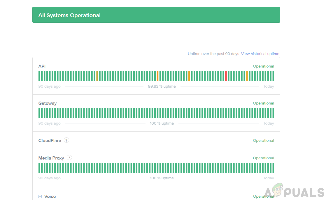 The most important step towards troubleshooting this issue is to determine the root cause behind it and we can do so by checking the status of Discords’ servers. This will help us to check if this error is limited to only your computer or the whole community is facing it. In order to do that:
