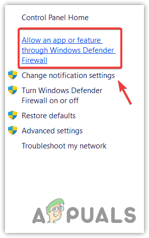 - Click on “Allow an app or feature through Windows Defender Firewall” from the left sidebar.