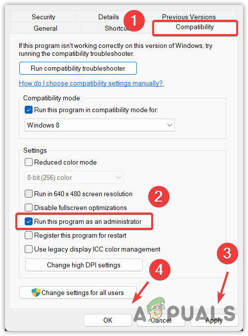 Right-click the game shortcut and go to its properties. Then go to Compatibility and tick Run this program as an administrator. Once done, click Apply and click OK.