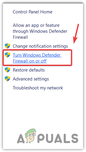 - Then, click Turn Windows Defender Firewall on or off from the left pane.