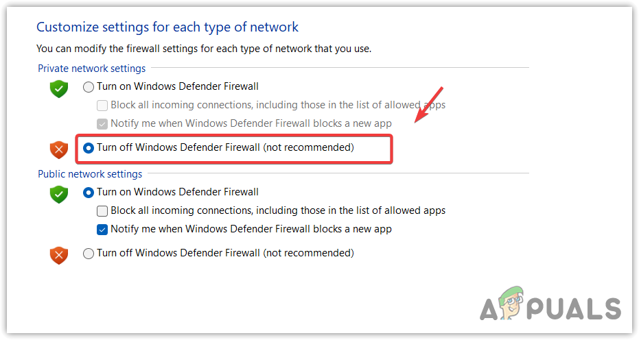 - Now select Turn off Windows Defender Firewall under the private network settings.