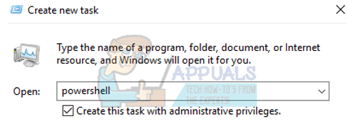 - Now type “powershell” in the dialogue box and check the option underneath which states “Create this task with administrative privileges”.