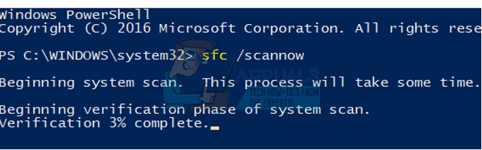 - Once in the Windows Powershell, type “sfc /scannow” and hit Enter. This process may take some time as your entire Windows files are being scanned by the computer and being checked for corrupt phases.