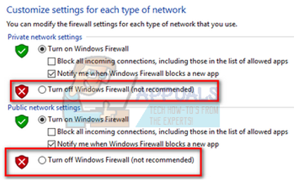 - Select the option of “Turn off Windows Firewall” on both the tabs, Public and Private Networks. Save changes and exit. Restart your computer and check if the problem gets resolved.