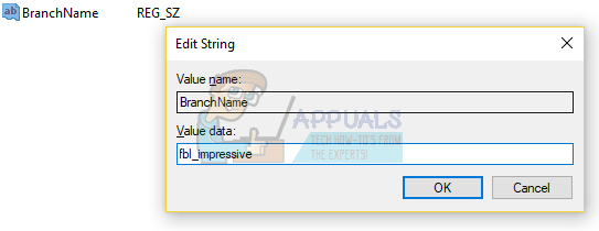 - Set the name of the new string as “BranchName”. After the new string is created, double-click it and type “fbl_impressive” in the Value data box. Press Ok to save changes.
