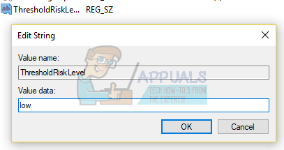 - Now create a new string just like we did above and name that new string as “ThresholdRiskLevel” and set the Value data to “low”. Press Ok to save changes.